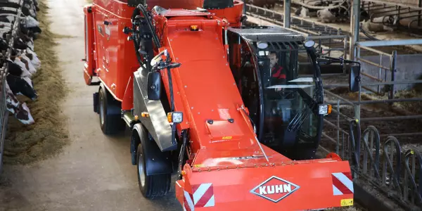 La taille de l’élevage est importante pour définir la capacité de l’automoteur de mélange. Il faut considérer à peu près 5 à 8 vaches laitières par m3 pour une ration à base d’ensilage. La gamme KUHN débute à 12 m3 et est proposée jusqu’à 27 m3.