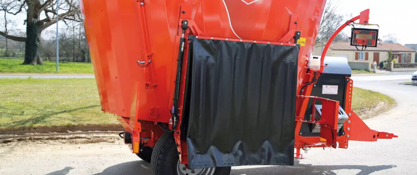 Disposant d’une plaque de déport, le cordon est suffisamment écarté pour ne pas souiller les fourrages avec les pneumatiques de la mélangeuse PROFILE. La toile de protection évite les projections de fourrages au-delà de l’auge.