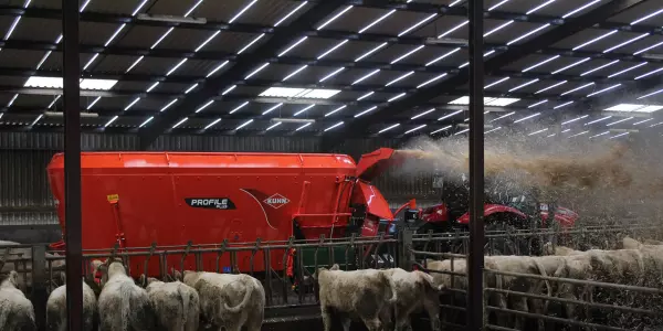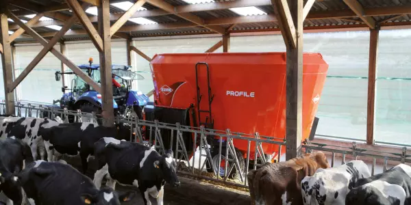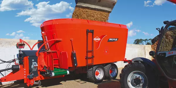 Mélangeuse PROFILE PLUS 2 CL à 2 vis verticales avec turbine de paillage, distribution transversale et conçue avec une caisse large. Déclinée de 24 à 34 m3, elle est destinée aux troupeaux de 120 à 265 vaches laitières.