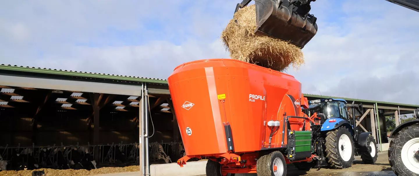 Pour que chaque ruminant du troupeau puisse s’alimenter au maximum de sa capacité d’ingestion, le cordon de ration mélangée doit être parfaitement homogène et régulier sur toute la longueur. Il faut limiter au minima la compétition entre individus d’un même lot. L’animal dominé doit pouvoir profiter aussi d’une ration mélangée de qualité !Durant les périodes de mises à l’herbe, la rentrée quotidienne des animaux dans les stabulations ne doit pas être synonyme de bousculades et d’agitation dans le troupeau : une ration homogène reste la meilleure solution.Pour assurer la distribution de la ration dans tous les bâtiments, la gamme PROFILE PLUS intègre une impressionnante palette de solutions de déchargement. Que vous disposiez de bâtiments non débouchants, d’auges avec muret de rétention ou avec des couloirs d’alimentation très étroits, de table d’alimentation en vis-à-vis nécessitant une distribution simultanée, ou d’autres contraintes nécessitant de distribuer complètement à l’arrière de la machine, etc… vous trouverez dans la gamme PROFILE PLUS la réponse à vos contraintes.