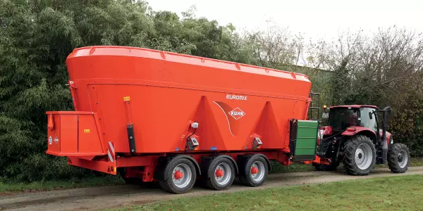 Mélangeuse EUROMIX à 3 vis verticales en distribution transversale et conçue avec une caisse large. Déclinée en versions 28, 33, 39 et 45 m3, elle est destinée aux troupeaux de 140 à 360 vaches laitières.