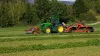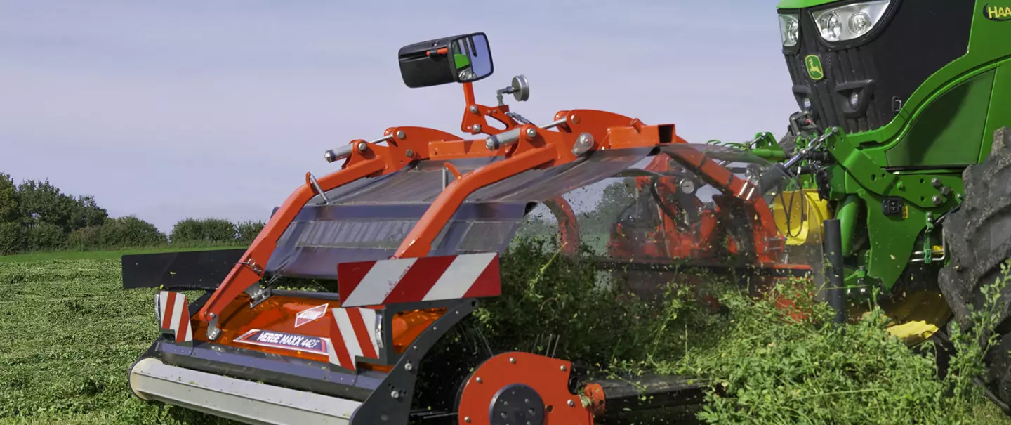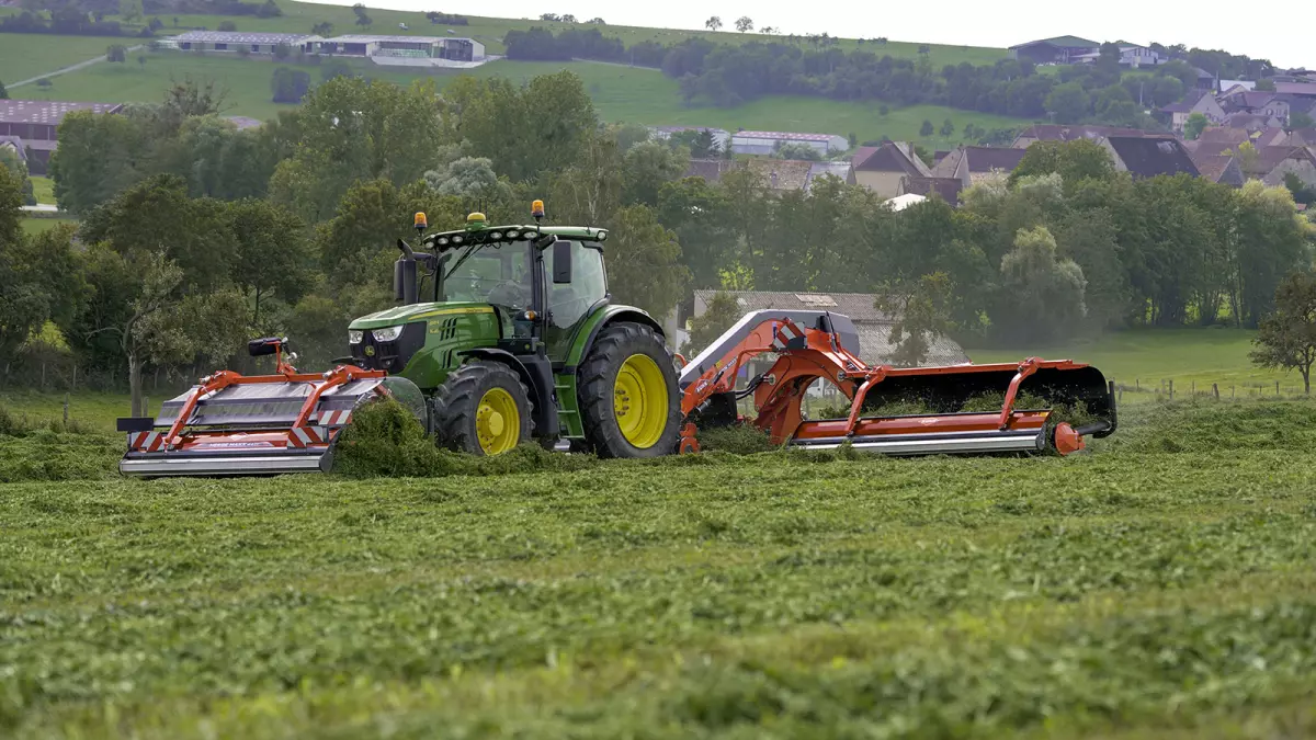 Le double tapis exclusif sur le modèle MERGE MAXX 442 F donne la possibilité à l'utlisateur de déposer un volume de fourrage égal vers chaque côté. Cet attelage frontal évite également à la culture d'être tassée par les roues du tracteur.