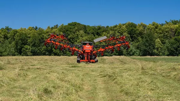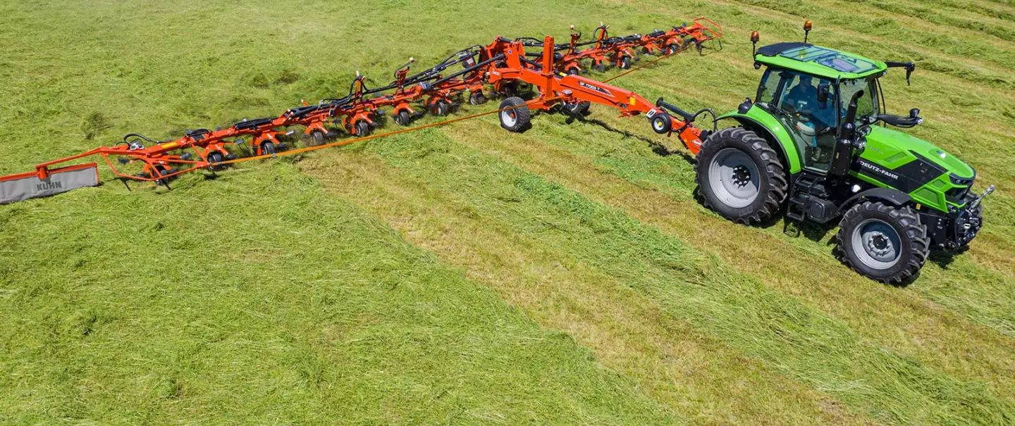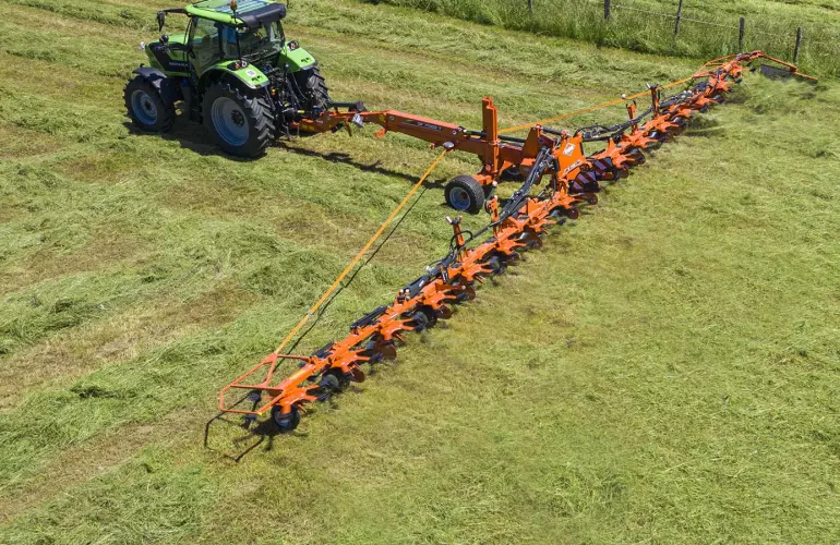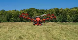 - Les rotors de petit diamètre s’adaptent individuellement au profil du terrain et au châssis porteur, assurant ainsi un retournement efficace et un séchage rapide du fourrage.