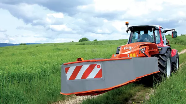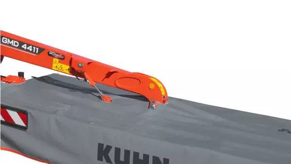Lorsque la barre de coupe glisse le long du sol, elle subit inévitablement des contraintes vers l'arrière (1). Plus ces contraintes s'intensifient, plus l'allègement du groupe du fauche augmente (2), s'adaptant de fait aux dénivellations du terrain. Cela apporte deux avantages : la préservation du tapis végétal et une introduction moindre d'impuretés dans les andains de faucheuses.
