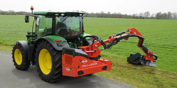 Pour un usage jusqu'à 400 h/an, KUHN a développé les faucheuses débroussailleuses POLY-LONGER d'une portée horizontale de 5 m et avec une puissance disponible du circuit rotor de 51 ch.